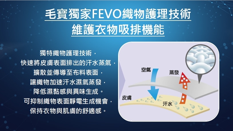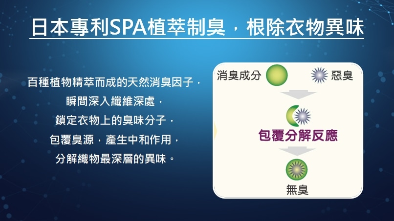 雙重洗淨因子、日本專利SPA植萃制臭、毛寶獨家FEVO織物護理技術