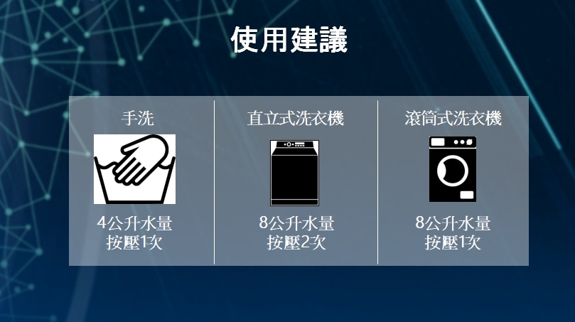 低泡沫不傷衣料:低泡沫配方,好沖洗不易殘留於衣物,降低洗劑堵塞於運動與機能衣物的纖維,而破壞衣物的機能性。且具高生物分解度,安心洗淨無負擔。
